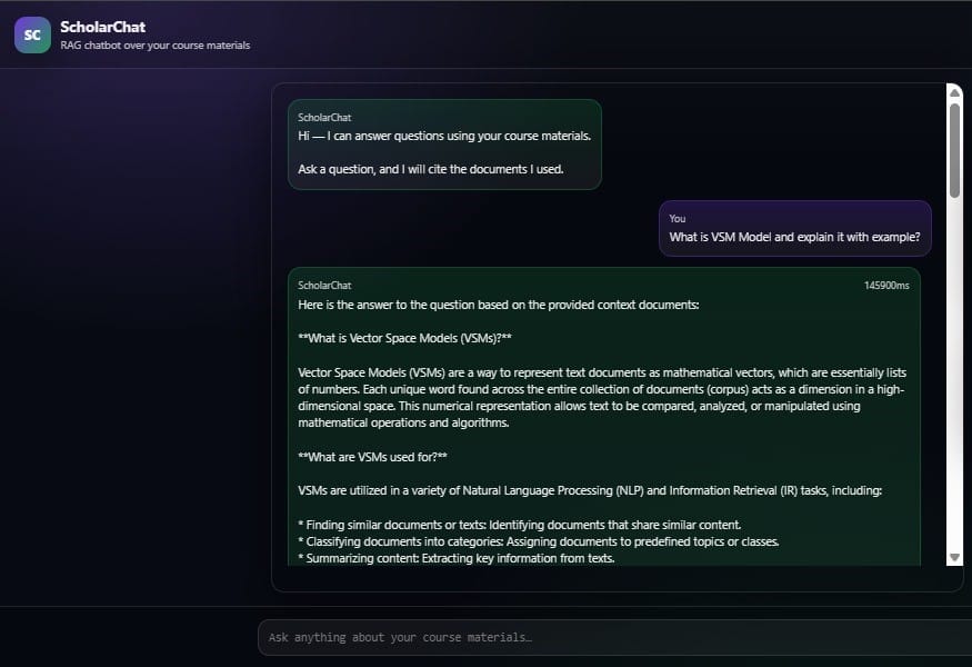 As seen in the screenshot above, our platform does not just pull raw text; it structures the response. Notice how the system explains Vector Space Models (VSMs) by breaking down their mathematical purpose and practical use cases in NLP. This level of clarity is only possible when your retrieval engine, built on FAISS and E5 embeddings, is finely tuned to understand document hierarchy.