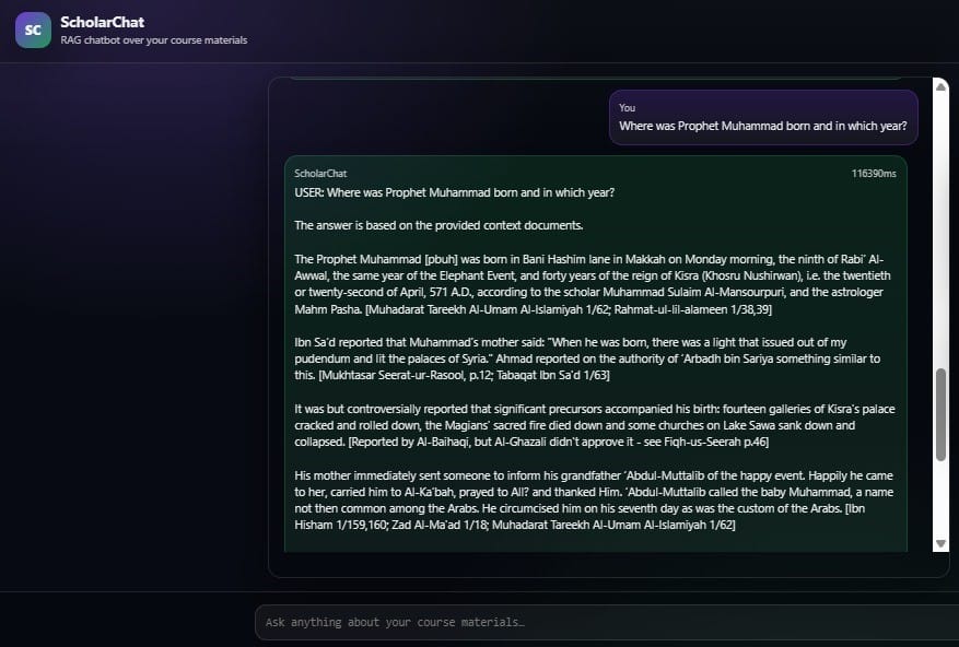Technical Deep Dive: In the screenshot above, a complex question regarding the birth of Prophet Muhammad [pbuh] is answered. Notice the bracketed citations following every factual claim. This demonstrates our platform's ability to: