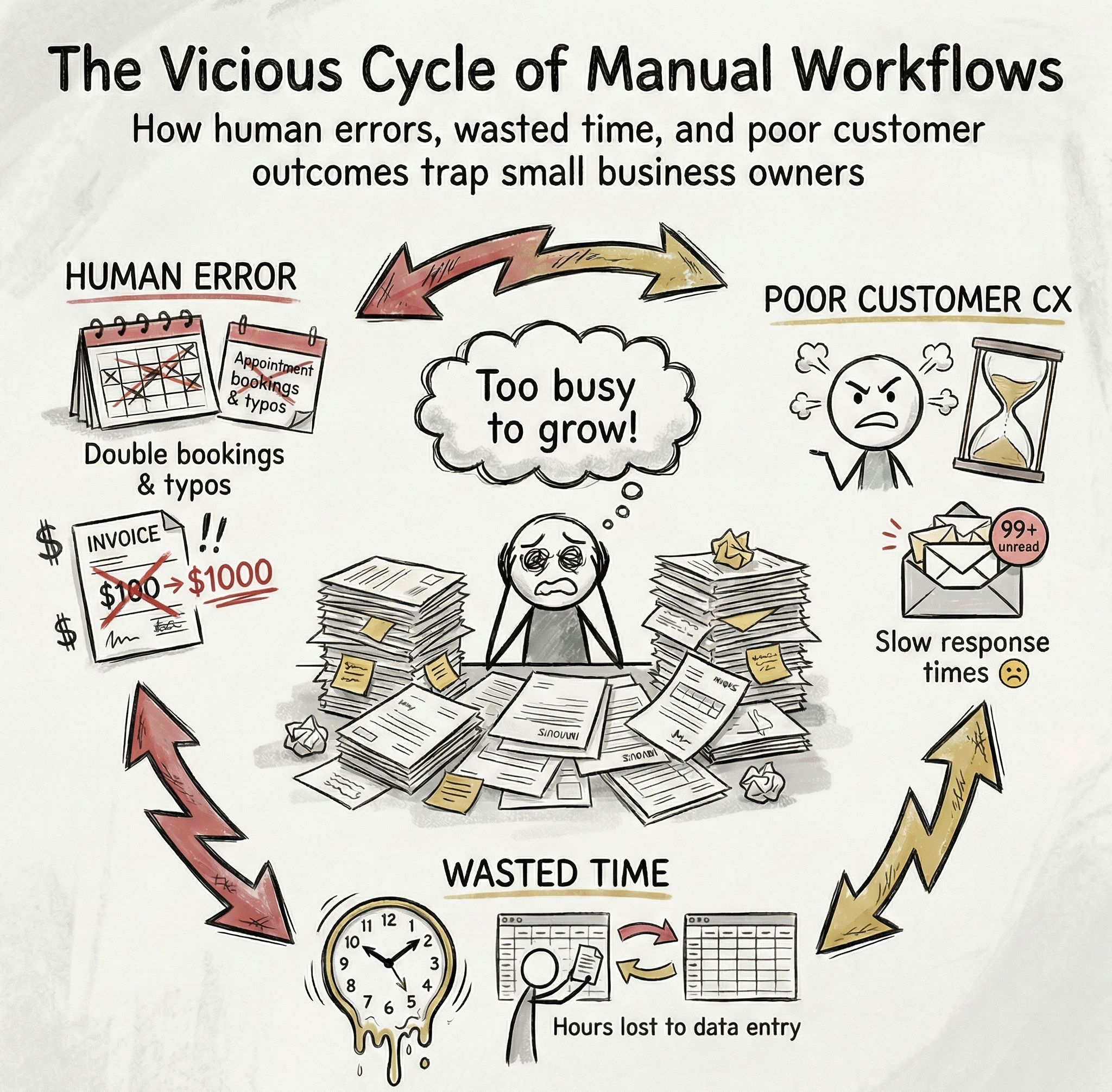 - Human Error: Typos in invoices or double-booking appointments.